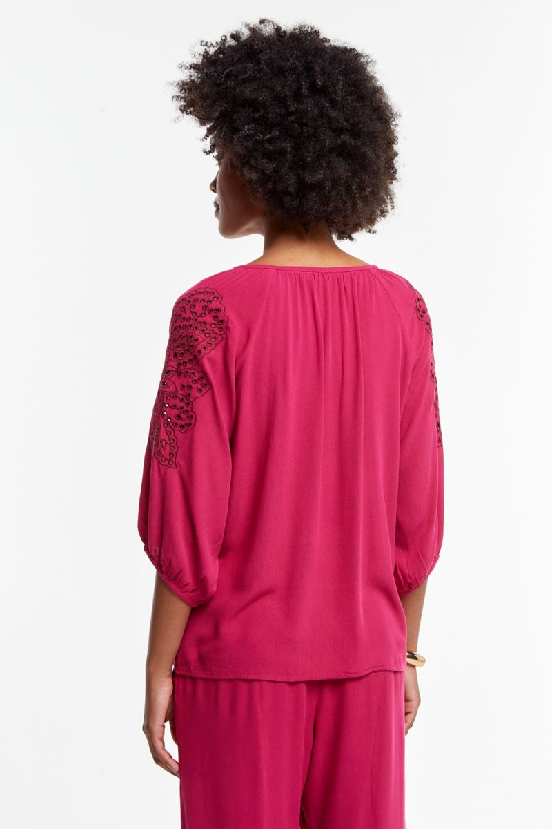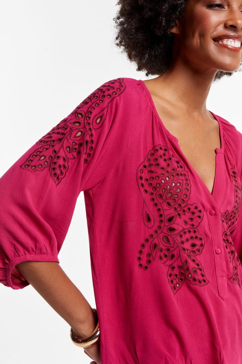 Desenvolvida em tecido leve com textura suave, ela apresenta bordados elaborados em toda a parte frontal e nas mangas, criando um visual rico e sofisticado. O decote em V com abotoamento frontal valoriza o colo, enquanto as mangas soltinhas trazem movimento e conforto sendo perfeita para iluminar qualquer produção.