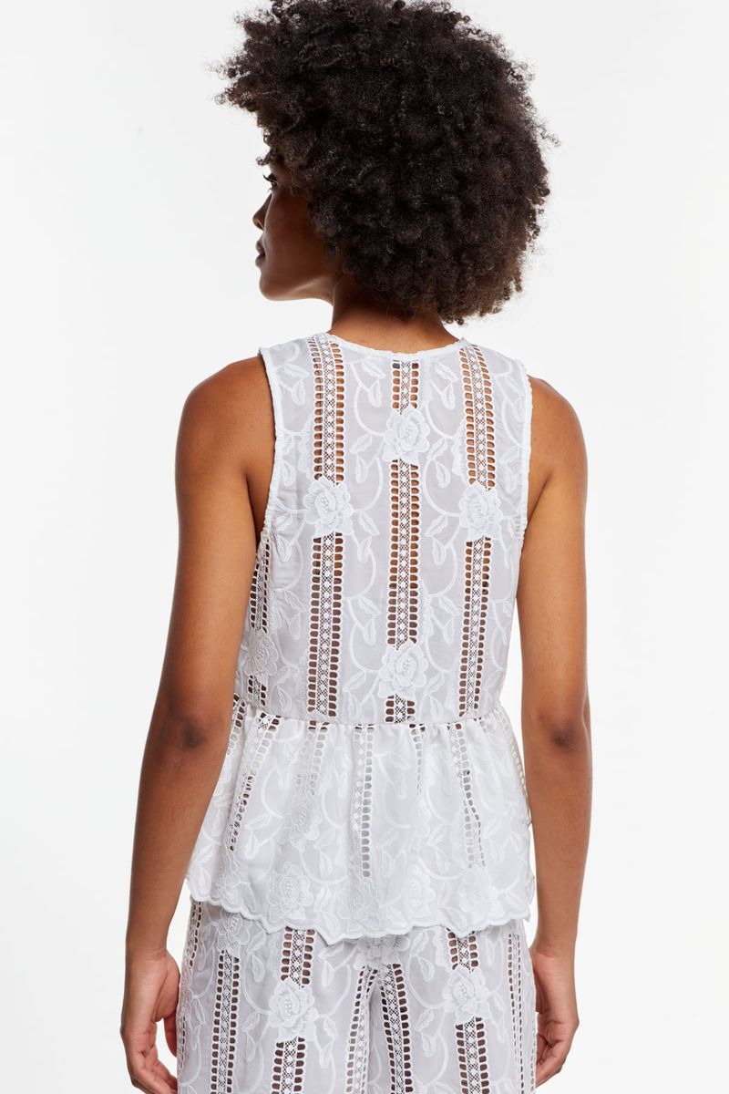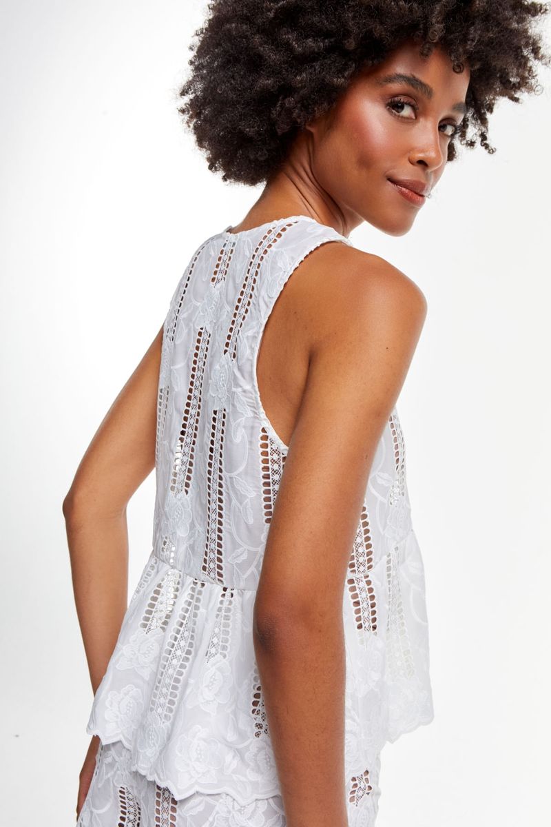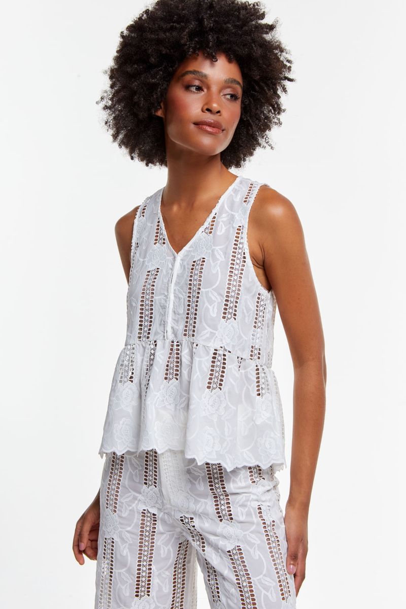 Com desenho floral em laise e recortes vazados que adicionam frescor e modernidade, a peça traz um caimento fluido com babado na barra, criando movimento suave e valorizando a silhueta. O decote em V alonga e ilumina a região do colo, enquanto o trabalho delicado do tecido transforma a bata em um clássico contemporâneo. Ideal para composições leves, elegantes e atemporais.
