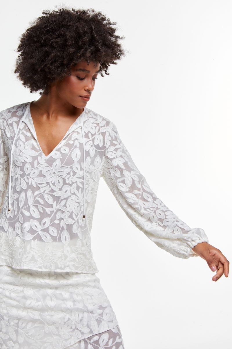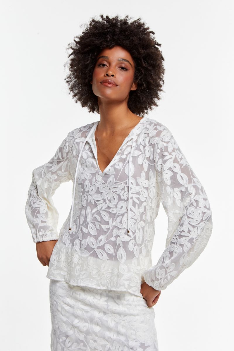 Seu caimento solto oferece conforto e movimento, enquanto o decote em V com amarração adiciona um toque moderno e feminino. Versátil e sofisticada, é a peça perfeita para compor coordenados com a Saia Renda Mint ou para elevar produções casuais com naturalidade.