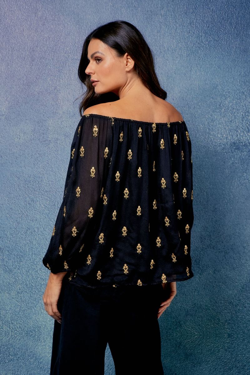 Confeccionada em tecido leve e fluido, a Blusa Bordado Gold apresenta modelagem solta que garante conforto sem perder a sofisticação. Seu decote ombro a ombro valoriza a silhueta de forma delicada, enquanto o bordado dourado minucioso confere luminosidade e charme à peça. Versátil e refinada, é ideal tanto para produções casuais elegantes quanto para composições mais sofisticadas.