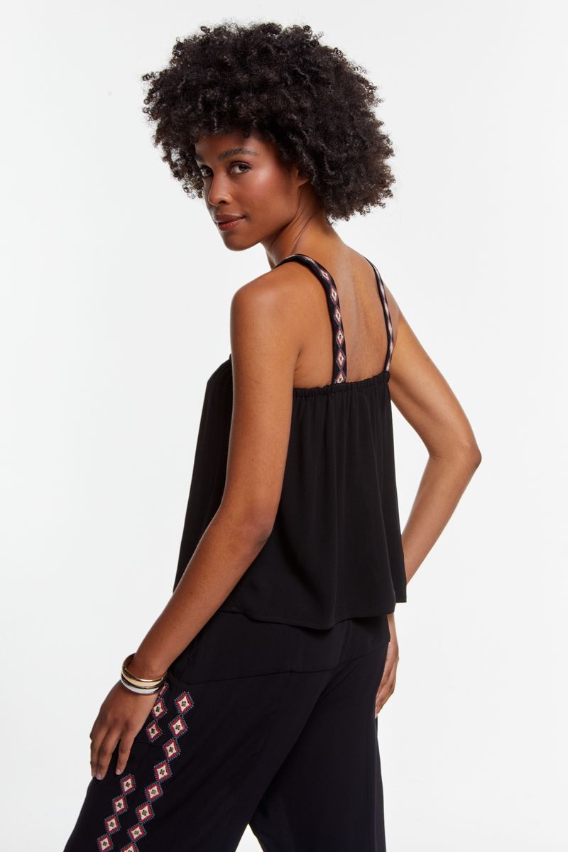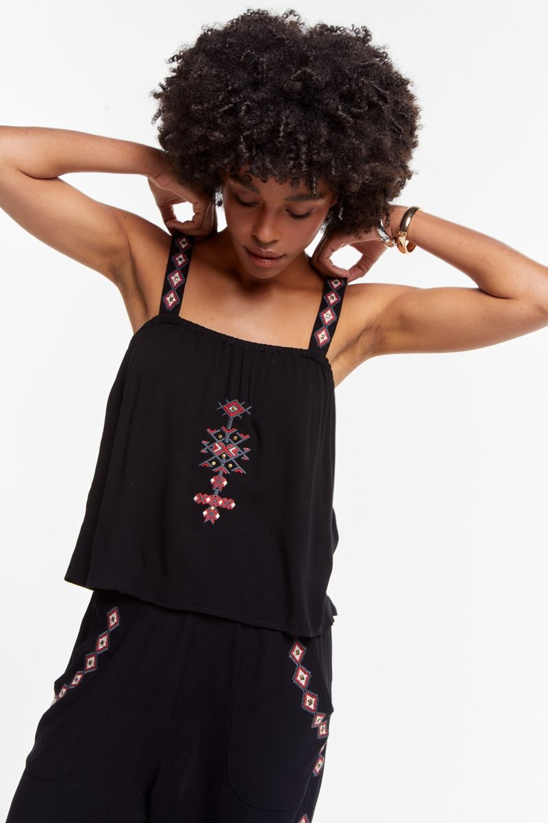 Confeccionada em tecido leve, destaca bordados geométricos em tons contrastantes enriquecidos por pequenas aplicações metálicas, criando um ponto focal marcante no centro da peça. As alças largas com o mesmo bordado elevam o acabamento e reforçam o charme handmade.