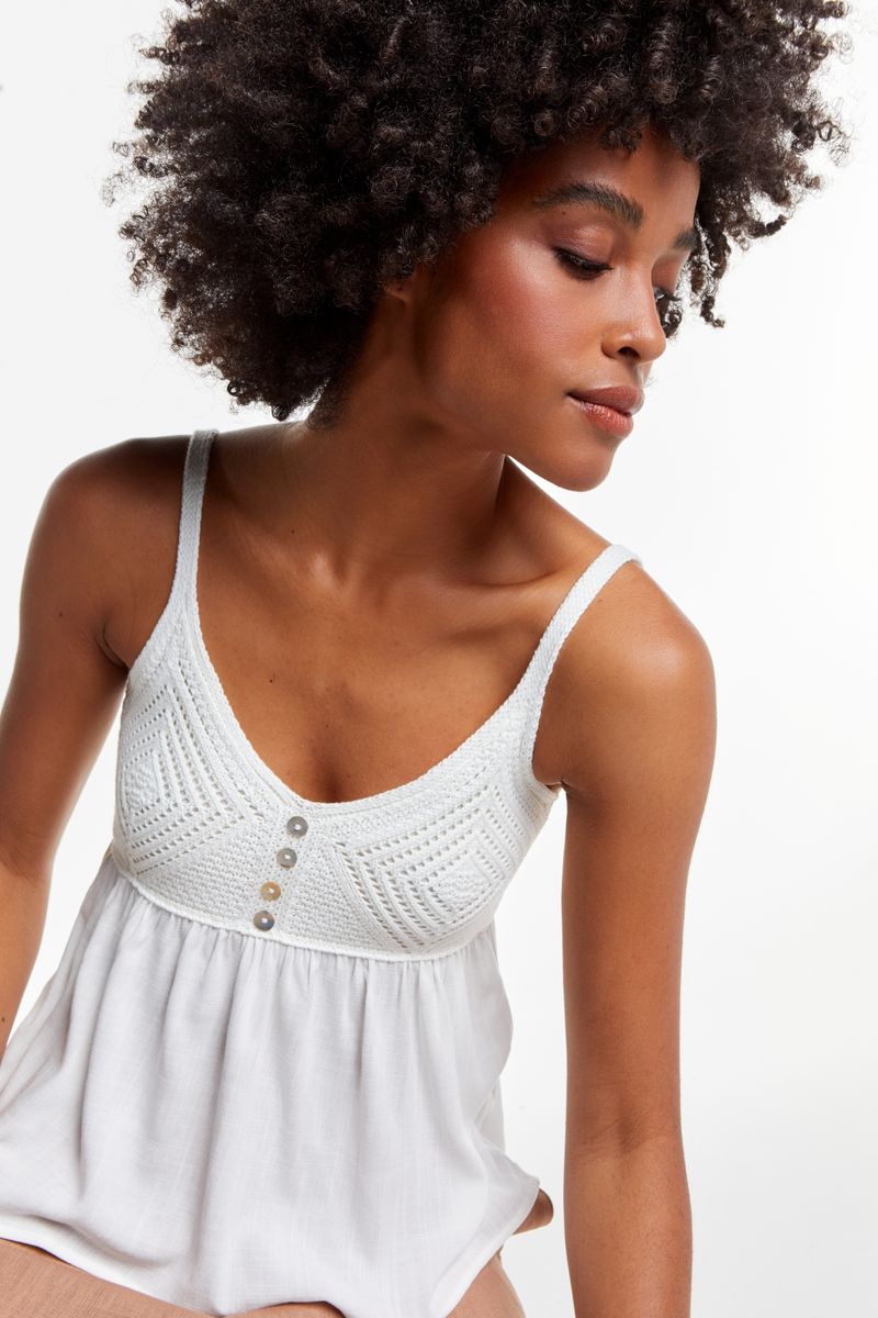 O busto em crochet traz textura e delicadeza, enquanto os pequenos botões acrescentam um charme extra. A parte inferior soltinha garante movimento e conforto para qualquer ocasião. Uma peça feminina e cheia de personalidade.