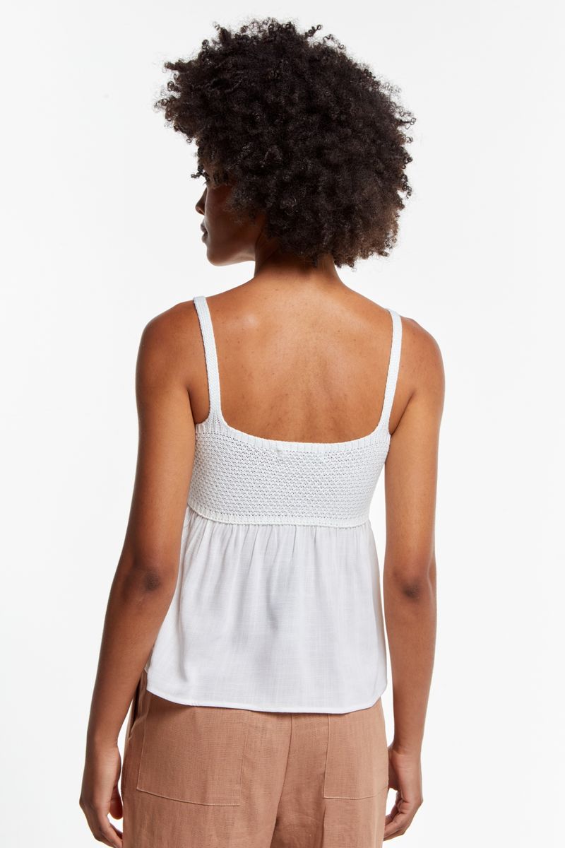 A Blusa com Detalhe Crochê une o romantismo do trabalho manual com a leveza do tecido fluido.