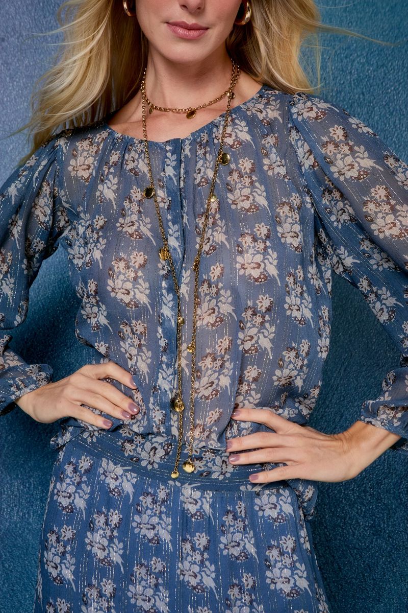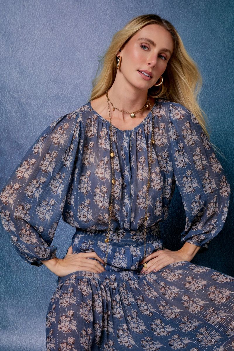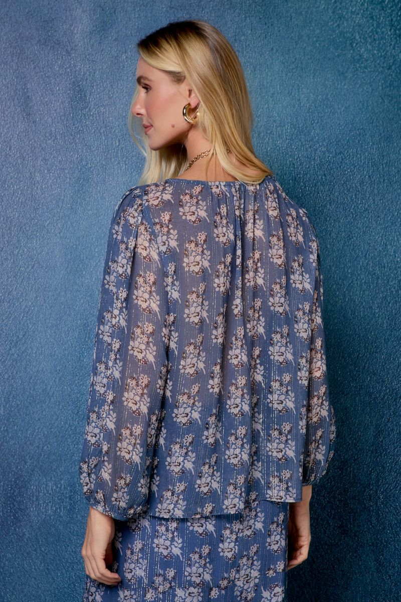 Confeccionada em seda leve e fluido, a peça apresenta estampa floral exclusiva com fios de lurex que adicionam brilho sutil e elegante. O modelo possui decote redondo, mangas longas bufantes com punho ajustado e caimento solto que valoriza o movimento, garantindo conforto e estilo em qualquer ocasião.