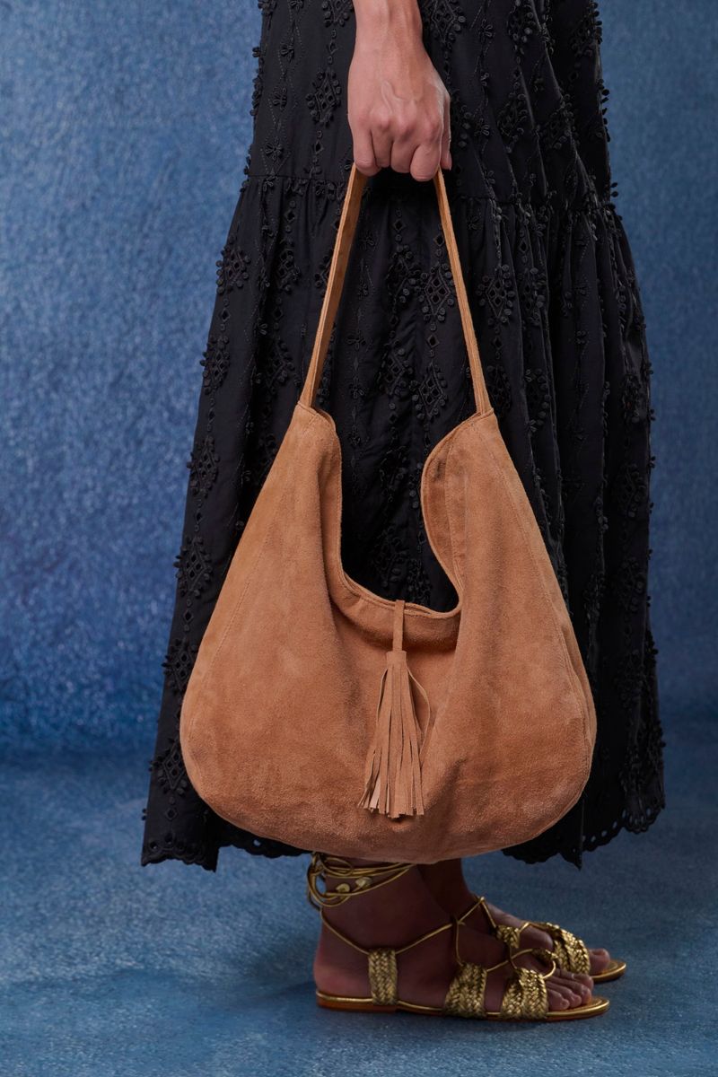 Confeccionada em camurça natural, apresenta design arredondado e estrutura macia que se adapta ao corpo com leveza e conforto. O acabamento em tassel frontal adiciona um charme artesanal, enquanto a alça larga garante praticidade no uso diário. Espaçosa e sofisticada, é ideal para acompanhar looks urbanos e composições casuais-chiques.