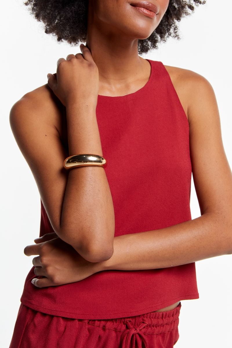 Com design arredondado e acabamento dourado de alto brilho, ele traz um toque de modernidade e presença ao look, elevando produções do dia a dia ou composições mais elaboradas. Seu fechamento articulado garante praticidade e segurança, tornando-o perfeito para usar sozinho ou em mix de pulseiras.