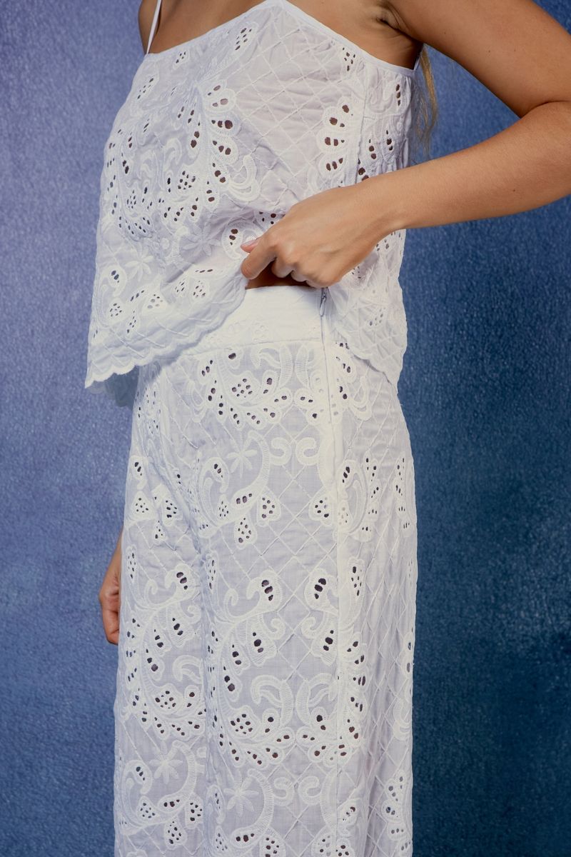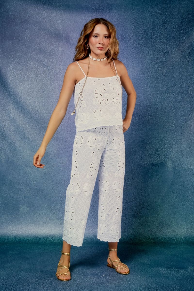 A Calça Bordado OlÍvia expressa sofisticação e originalidade através de seu bordado delicado.