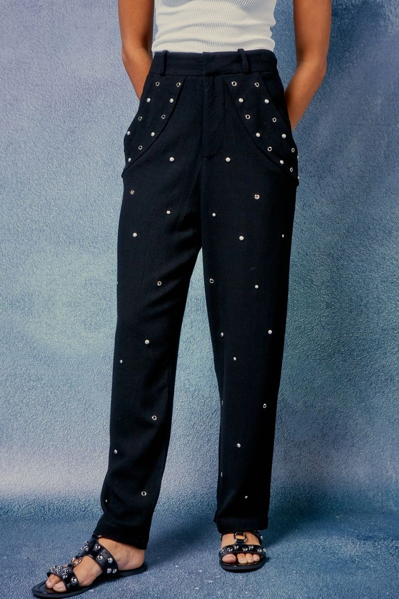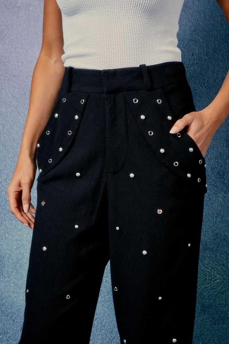 A Calça Detalhe Tachas traz um toque de ousadia e modernidade para o guarda-roupa feminino.