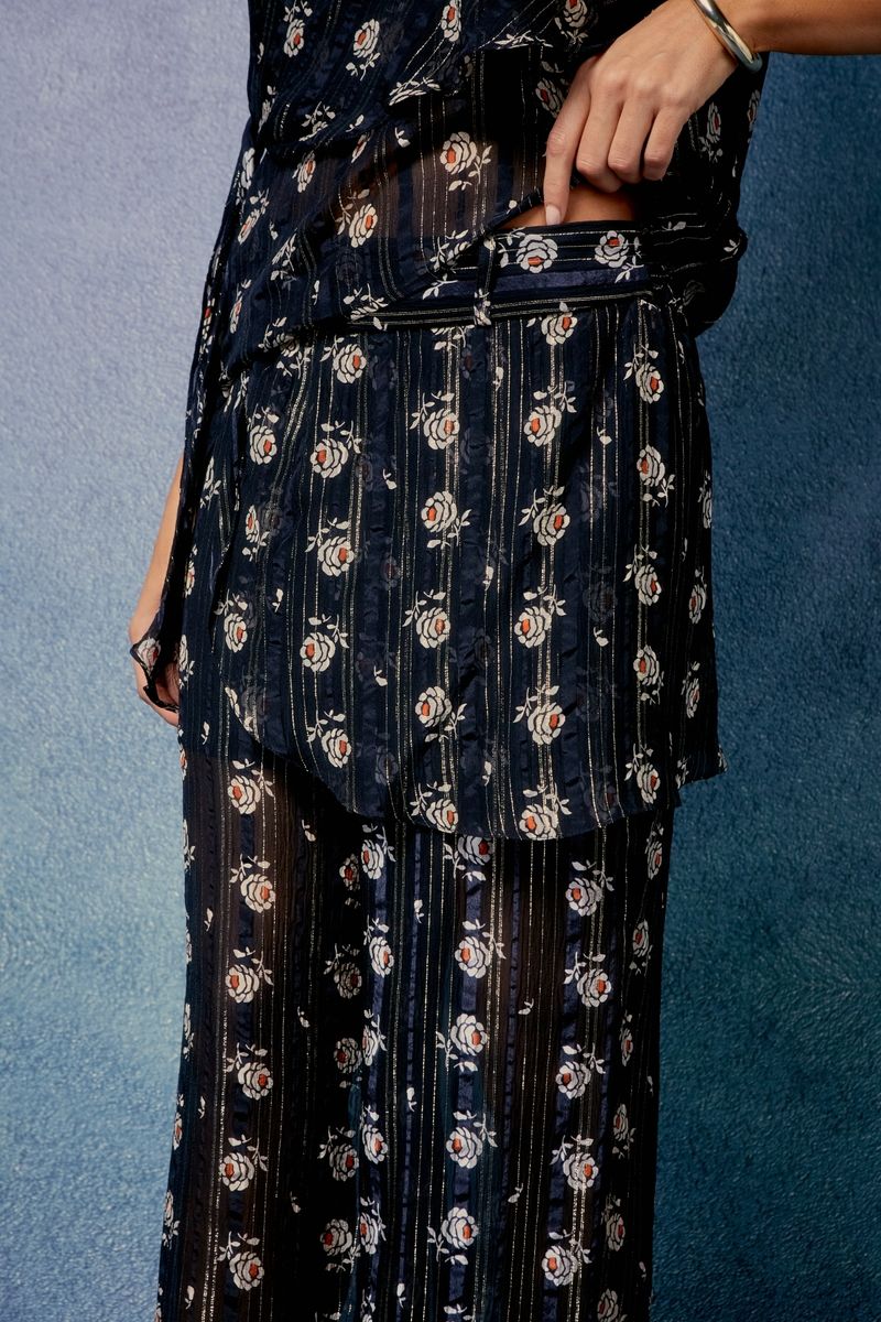 Seu caimento leve realça o movimento do corpo, enquanto os detalhes da modelagem fazem dela uma escolha ideal para produções elegantes e cheias de estilo. A estampa floral em tons suaves se destaca sobre o fundo preto, criando um contraste refinado realçado pelos fios de lurex dourado que percorrem verticalmente o tecido. O detalhe frontal sobreposto confere originalidade ao design, enquanto os passadores de cinto permitem personalizar o look com acessórios. O cós com elástico na parte de trás garante um ajuste confortável sem comprometer a sofisticação da peça.