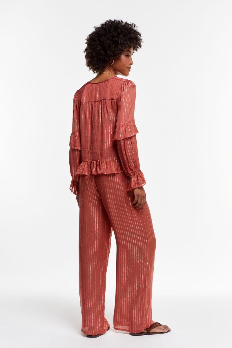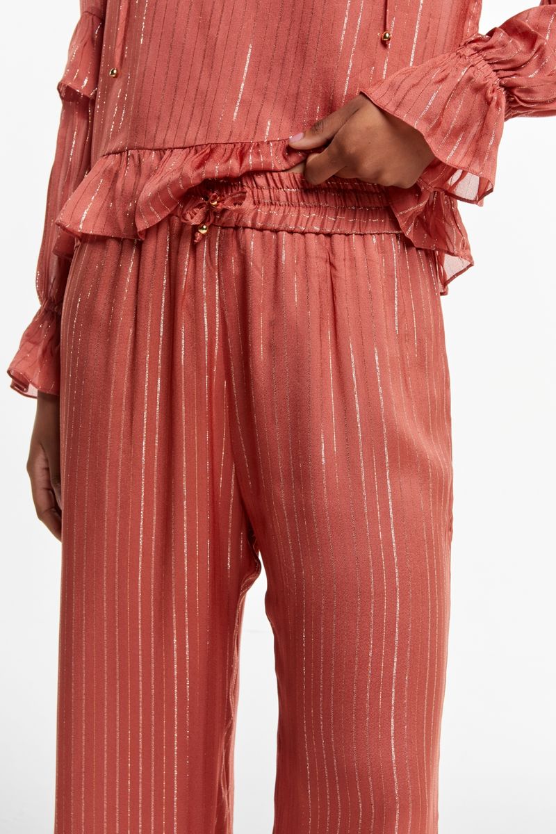 O tecido leve com listras metalizadas cria um efeito cintilante sutil, perfeito para looks casuais com um toque de glamour. A cintura com elástico e amarração promete ajuste perfeito, enquanto a modelagem soltinha garante movimento e leveza ao vestir.