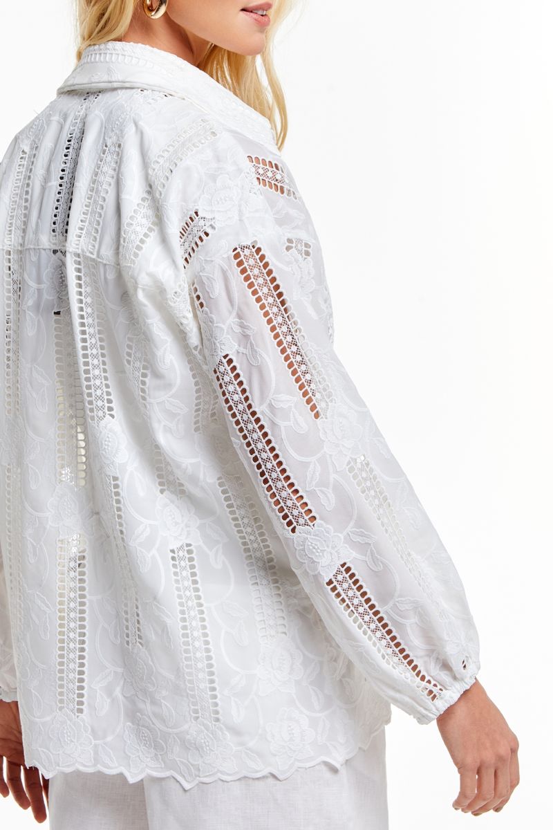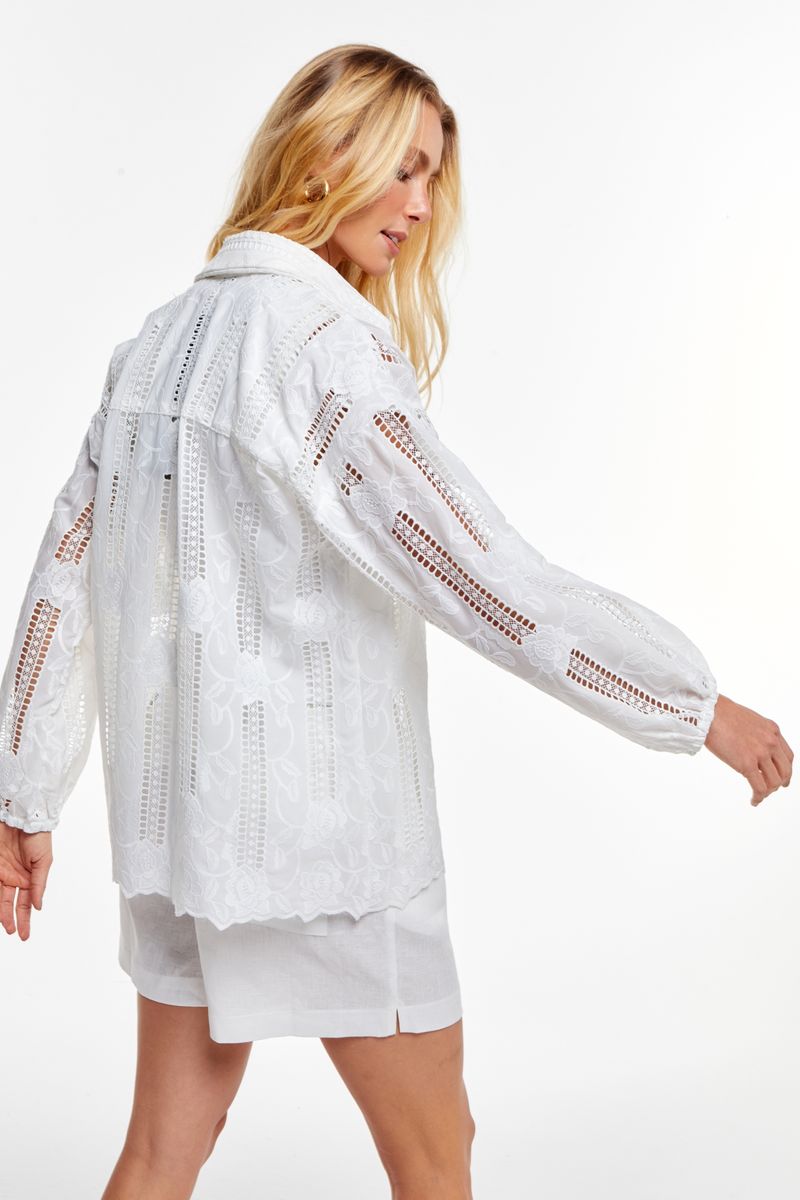 Seu bordado em laise floral adiciona textura e transparência delicada, enquanto o desenho soltinho traz conforto sem perder o charme. O caimento suave acompanha os movimentos com naturalidade, fazendo da camisa uma escolha perfeita tanto para looks casuais quanto para produções mais elaboradas.