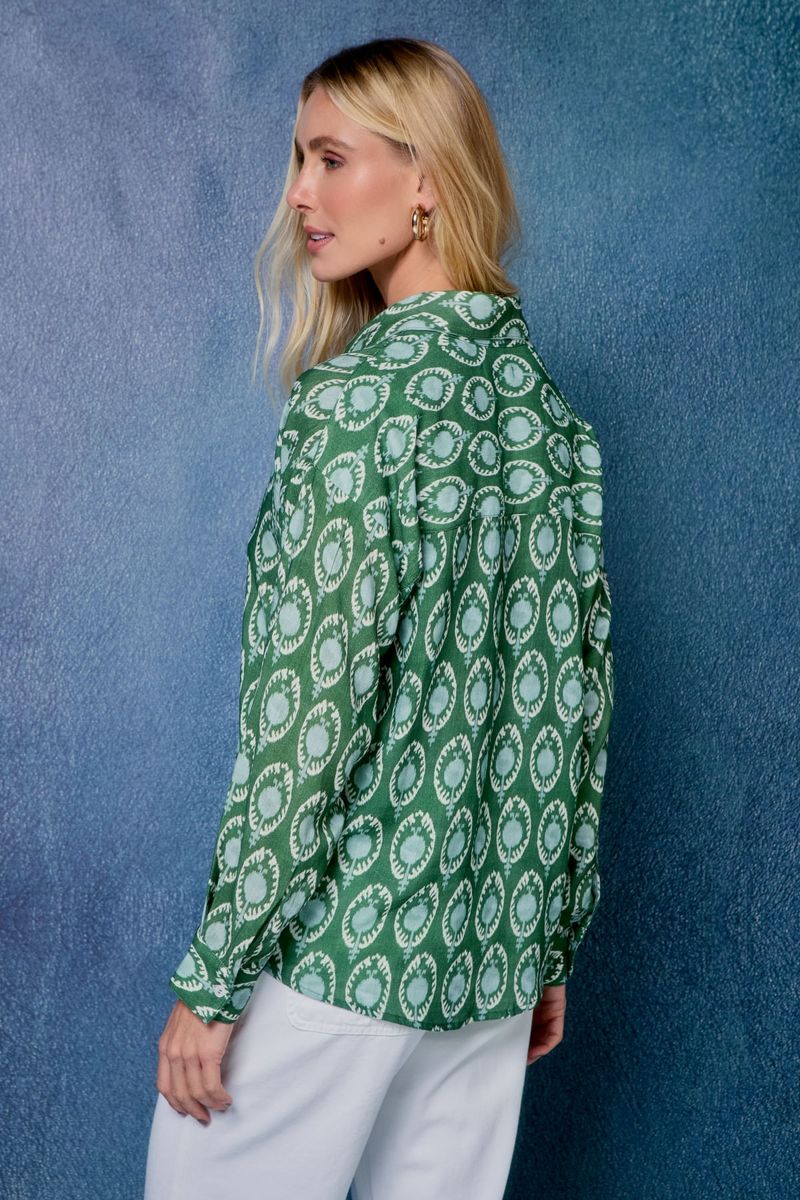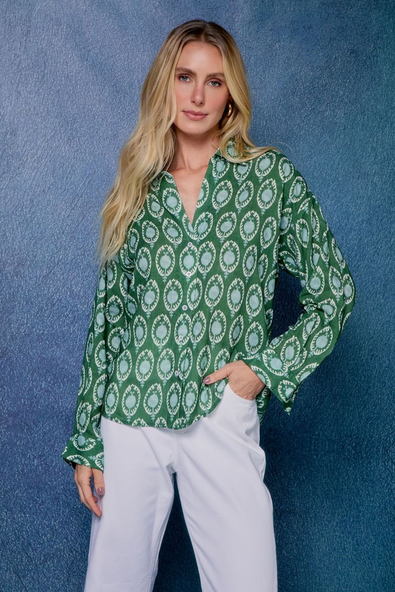Confeccionada em tecido leve de toque macio, apresenta estampa exclusiva em tons de verde que garante modernidade ao look. O modelo possui gola clássica, abotoamento frontal e mangas longas com punhos ajustáveis, trazendo praticidade e estilo atemporal.