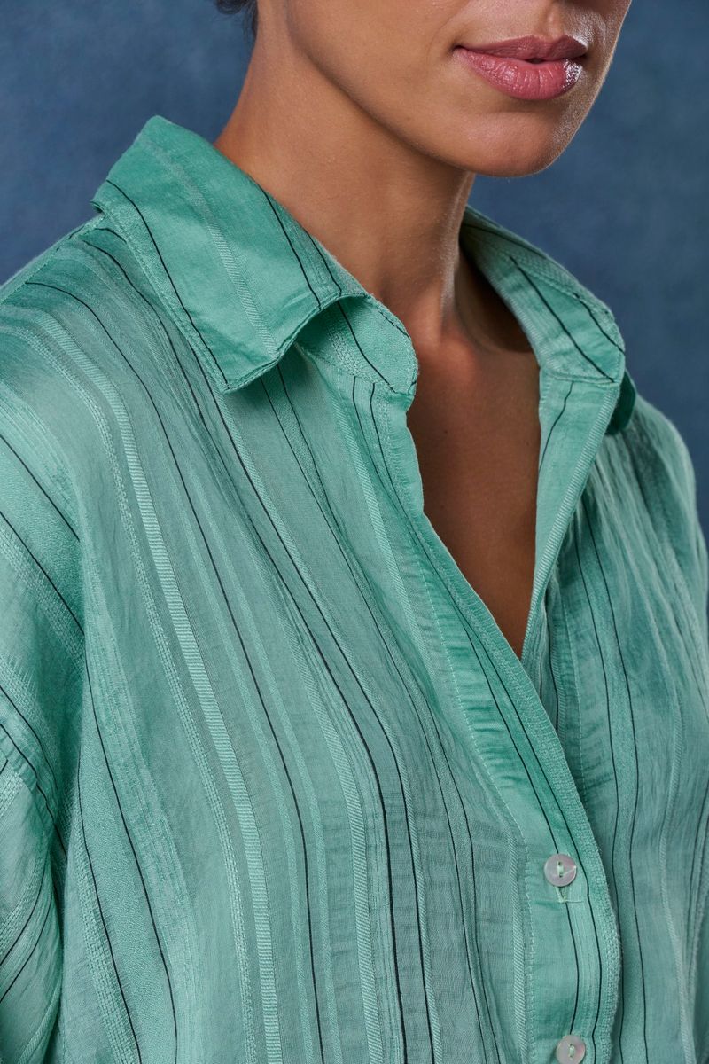Confeccionada em tecido misto com toque suave e textura sutil, a peça apresenta listras delicadas em tom monocromático que trazem refinamento e modernidade. Seu caimento solto e o shape levemente oversized conferem conforto e movimento, enquanto a gola clássica e os punhos ajustáveis reforçam o charme natural da alfaiataria descontraída. Ideal para usar com jeans, alfaiataria ou saias fluidas.