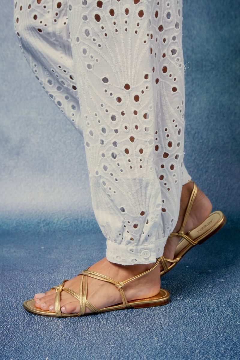 Confeccionada em couro metalizado dourado, possui tiras finas entrelaçadas que proporcionam leveza e delicadeza ao visual. O fechamento no tornozelo garante segurança e ajuste confortável, enquanto o solado baixo assegura praticidade para o dia a dia. Elegante e funcional, é a escolha ideal para compor produções que transitam facilmente do casual chic ao sofisticado.