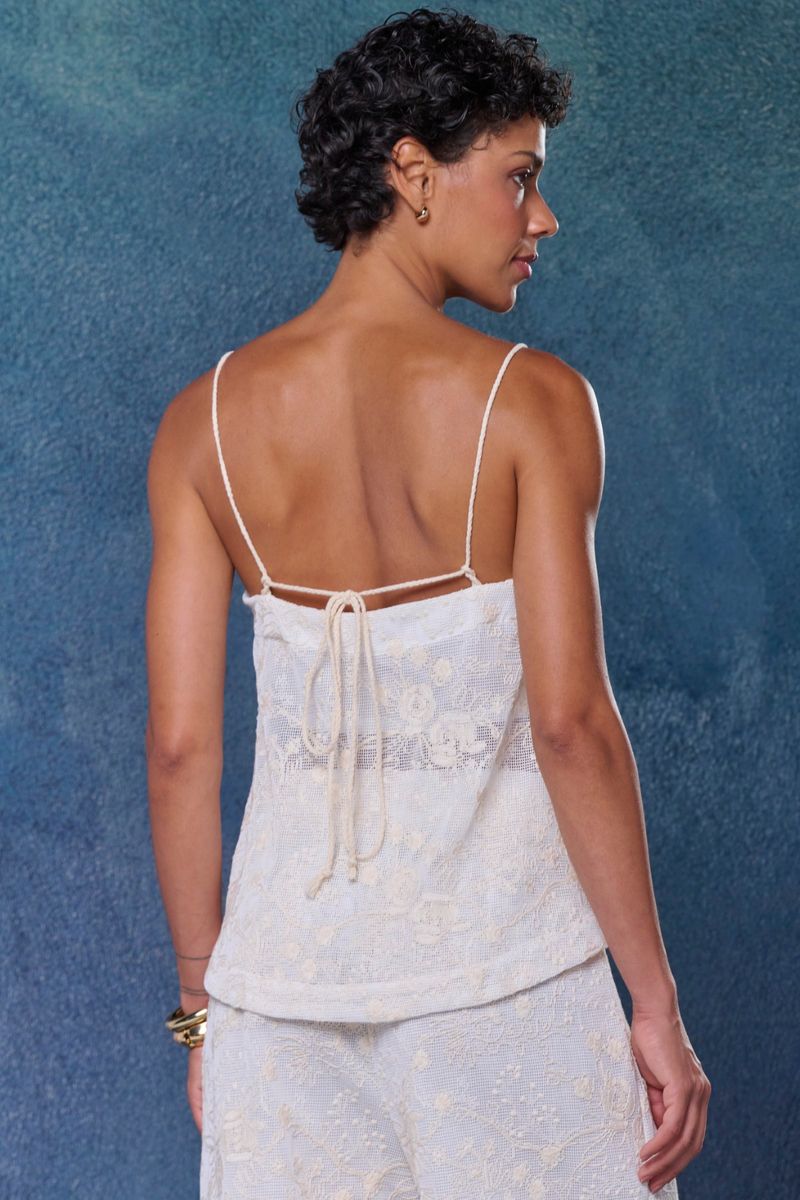 O caimento soltinho valoriza a silhueta com naturalidade, enquanto as alças finas e a amarração nas costas trazem charme artesanal ao visual. Uma peça que conversa com looks diurnos e noturnos, mantendo sempre um toque de frescor e feminilidade.