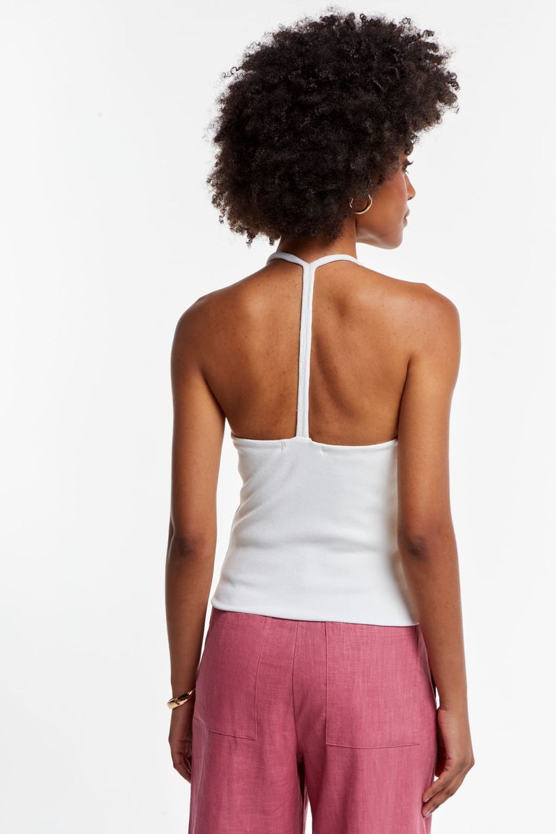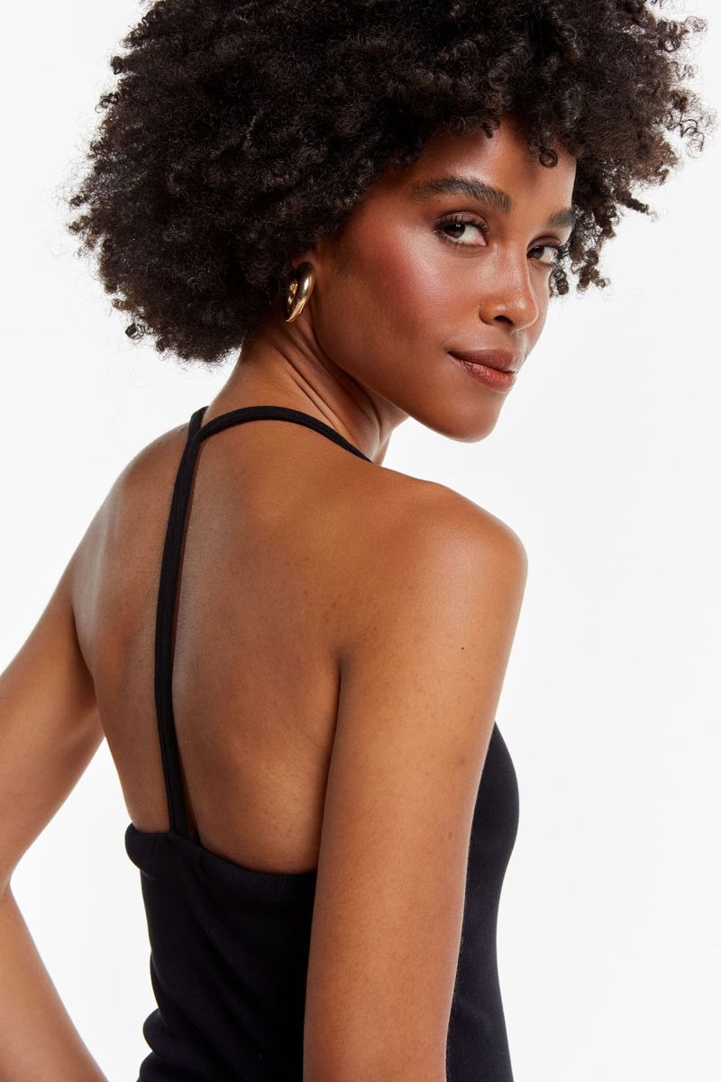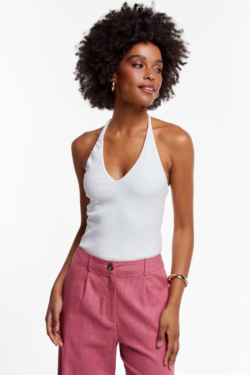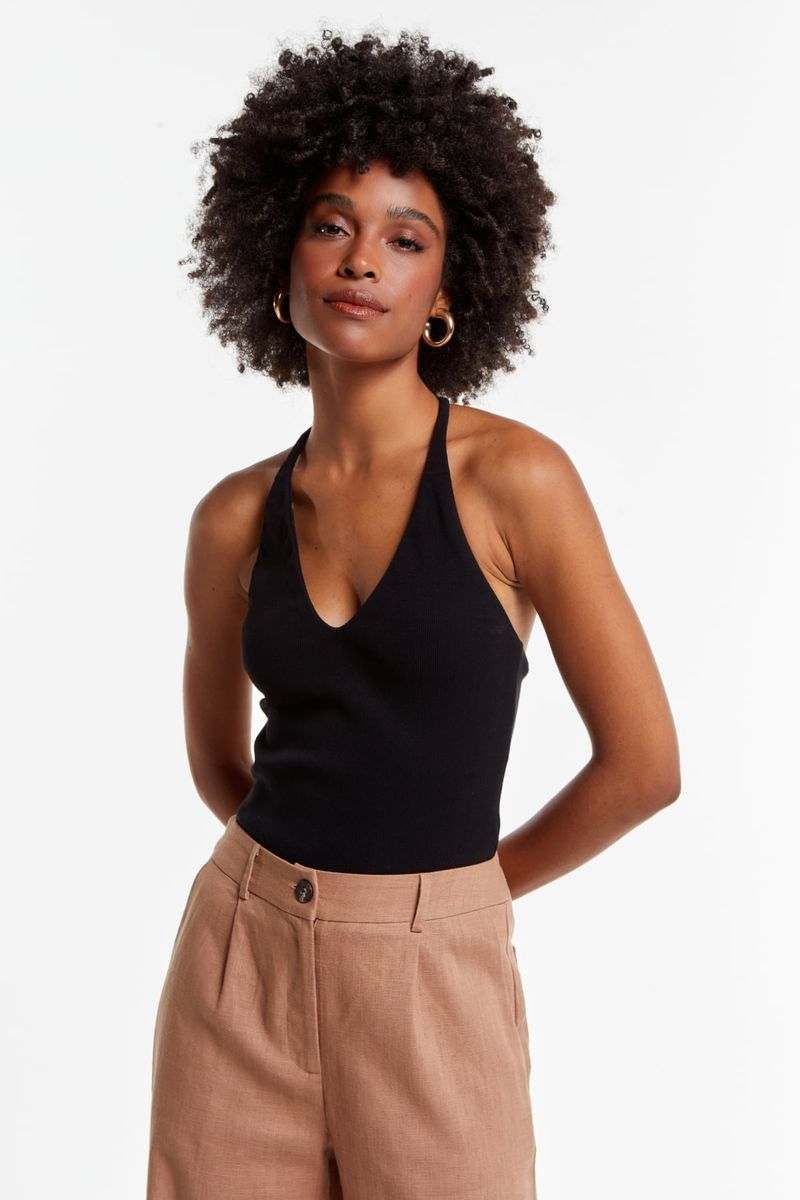 O decote em V alonga a silhueta, enquanto as alças mais finas e o detalhe posterior criam um visual atual. Confeccionada em material canelado duplo, oferece ótima estrutura, firmeza e zero transparência.