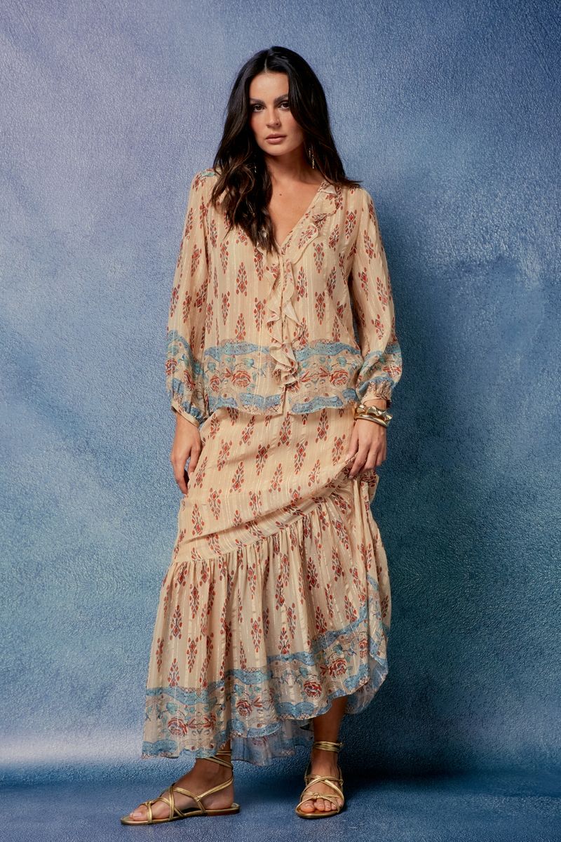 Confeccionada em seda leve com delicado fio de lurex, a Saia Longa Estampa Salus Lurex traz frescor e fluidez em cada detalhe. Sua modelagem evasê com babado na barra cria um movimento elegante e cheio de charme, enquanto a estampa floral exclusiva em tons suaves é realçada pelo brilho sutil do lurex. Versátil e sofisticada, é a peça perfeita para composições que transitam do casual refinado ao elegante, garantindo estilo atemporal em qualquer ocasião.
