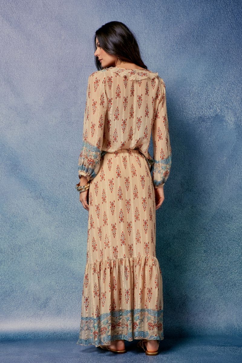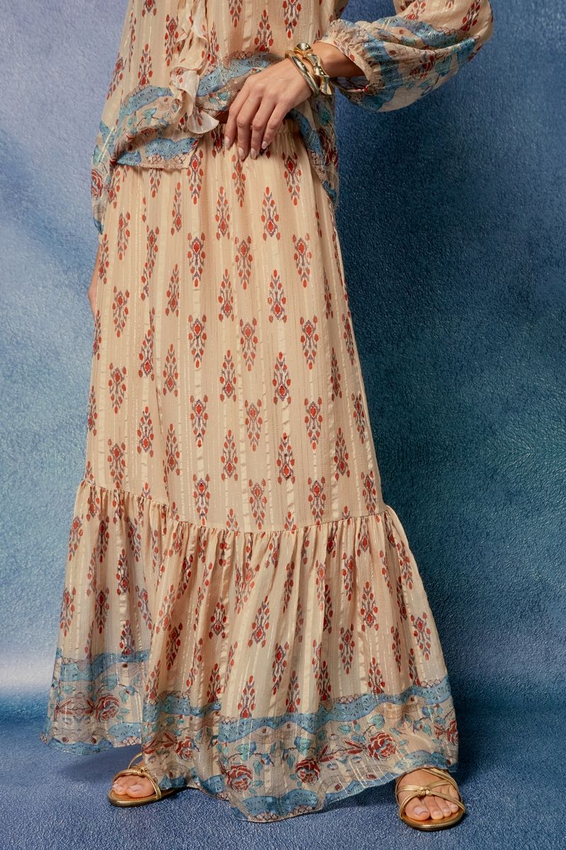 A Saia Longa Estampa Salus Lurex revela feminilidade e movimento com toque sofisticado.