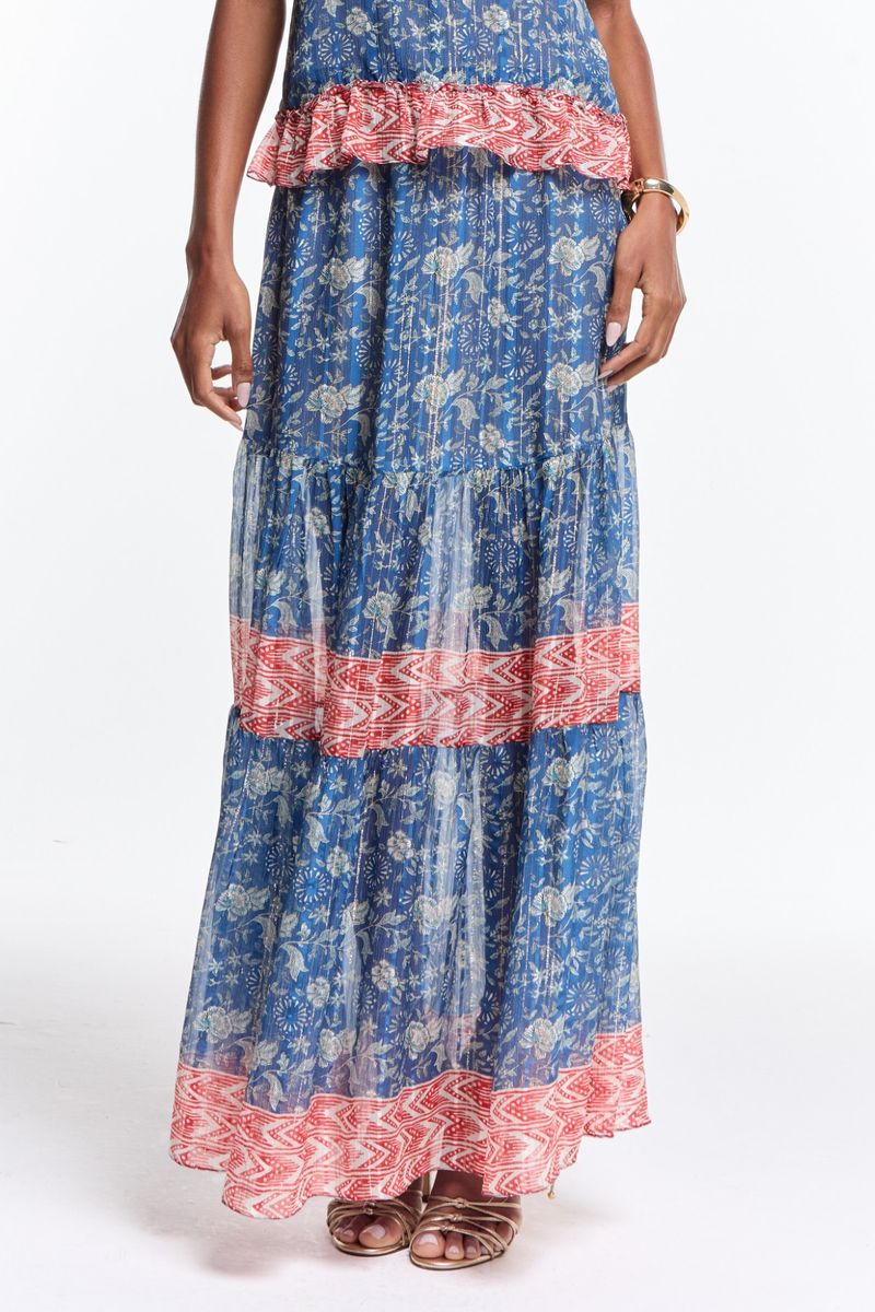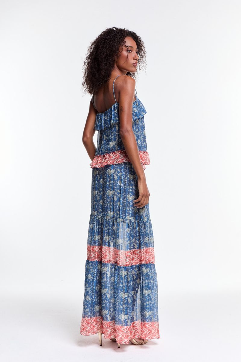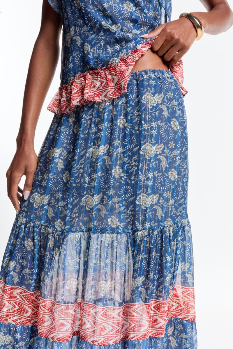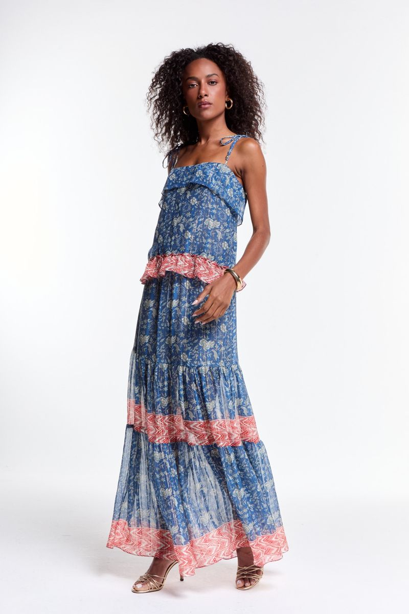 Confeccionada em seda com fios de lurex, exibe um caimento impecável e brilho sutil que realça o movimento da peça. O design em camadas com babados, aliado à estampa floral exclusiva e às faixas contrastantes nas barras, cria um visual feminino e elegante. Ideal para compor looks leves e sofisticados, seja em ocasiões especiais ou produções casuais com estilo.