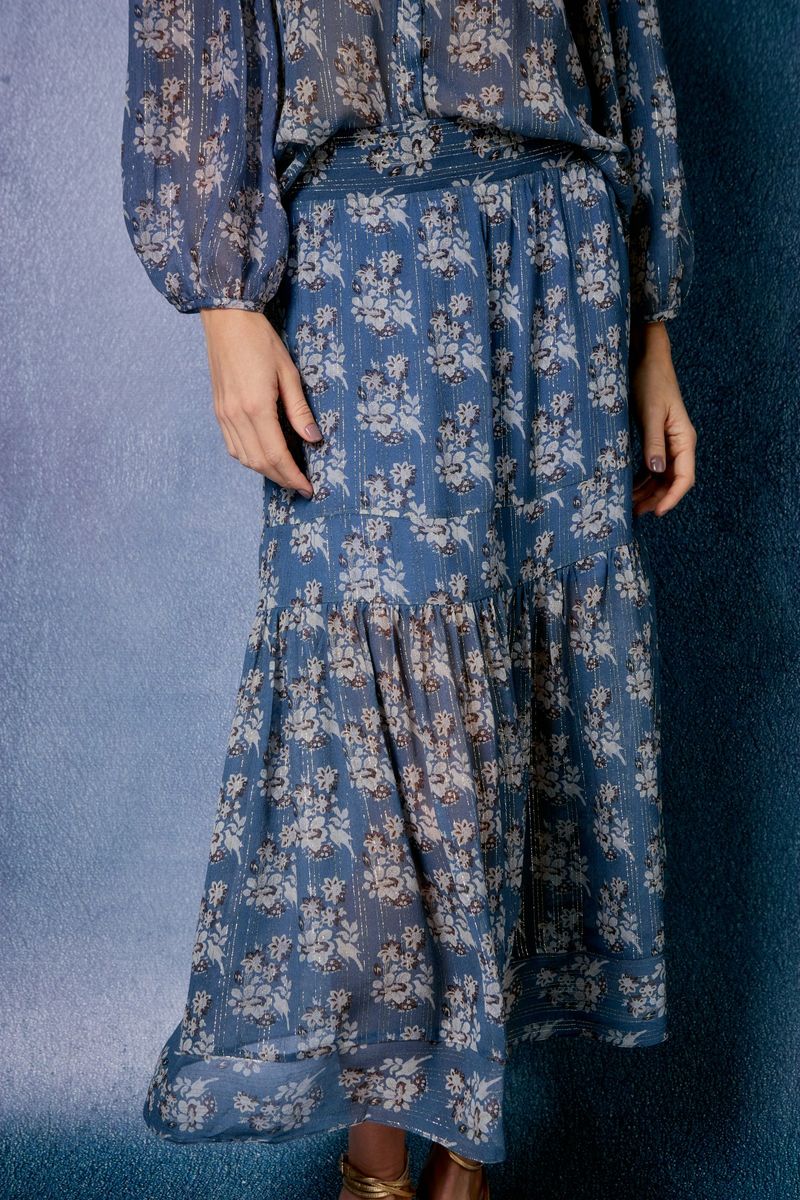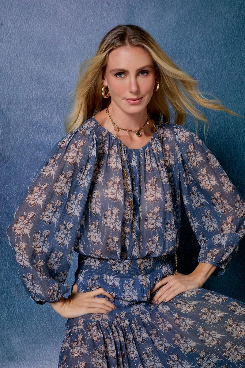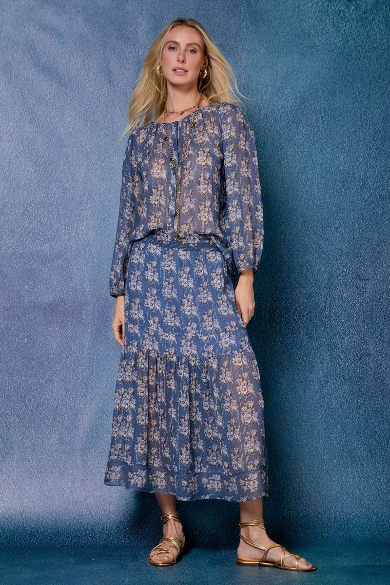 Confeccionada em seda fluida, a peça ganha ainda mais charme com a estampa floral delicada e o brilho sutil dos fios de lurex. O cós confortável valoriza a cintura, enquanto o caimento soltinho com babado na barra adiciona movimento e romantismo ao visual.