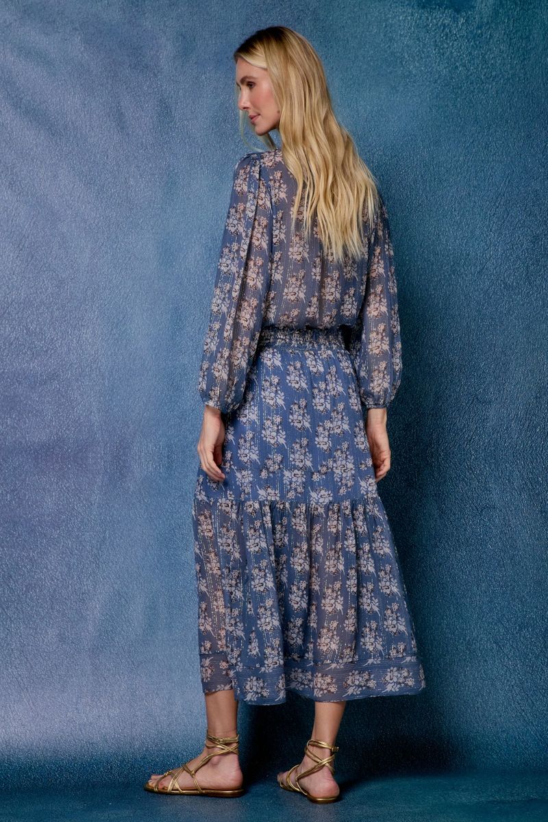A Saia Midi Estampa Divus Lurex une delicadeza e sofisticação em um design atemporal.