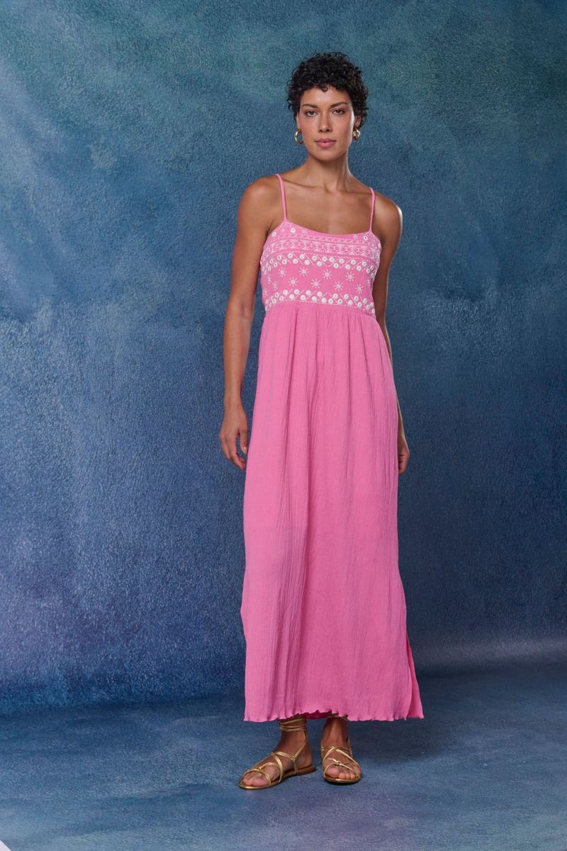 Confeccionado em tecido leve e fluido, o modelo apresenta busto bordado com delicados apliques de espelhos, que conferem brilho sutil e charme boho à produção. As alcinhas finas valorizam o colo, enquanto o lastex nas costas proporciona conforto e melhor ajuste ao corpo. O comprimento alongado e o caimento solto garantem movimento e elegância, ideal para compor looks de verão cheios de estilo.