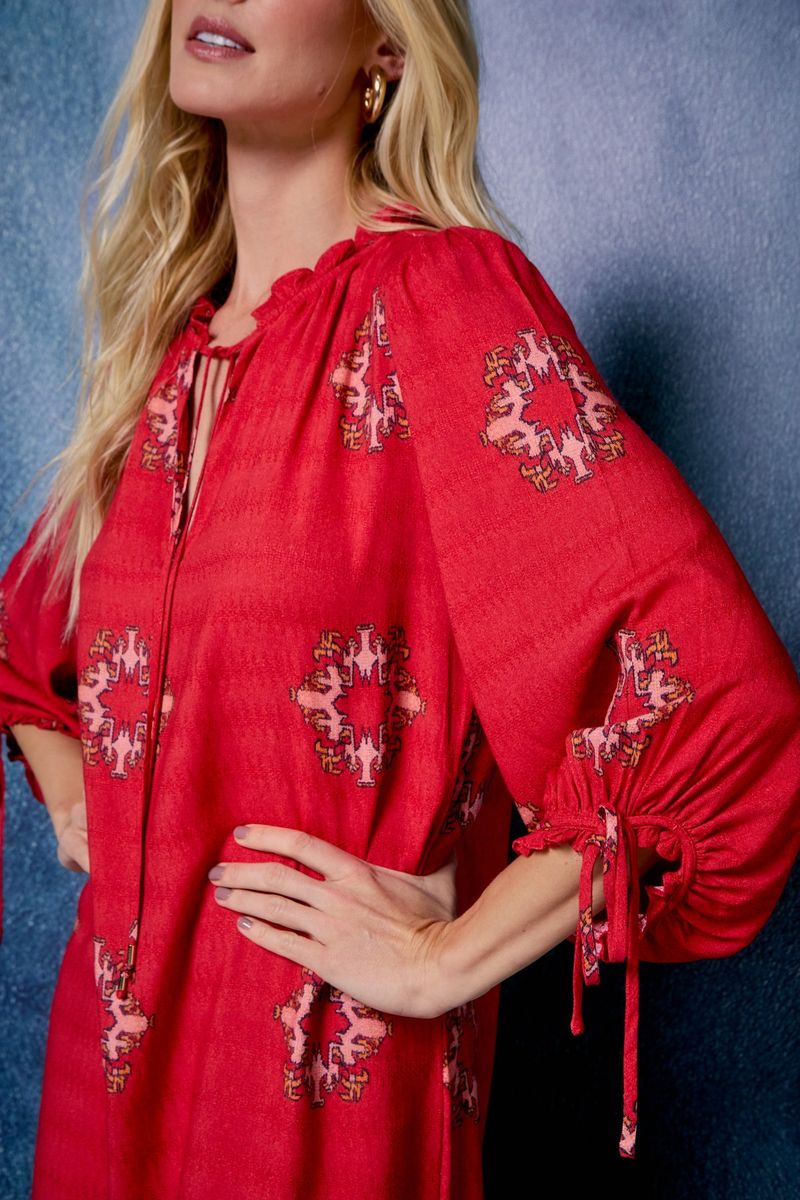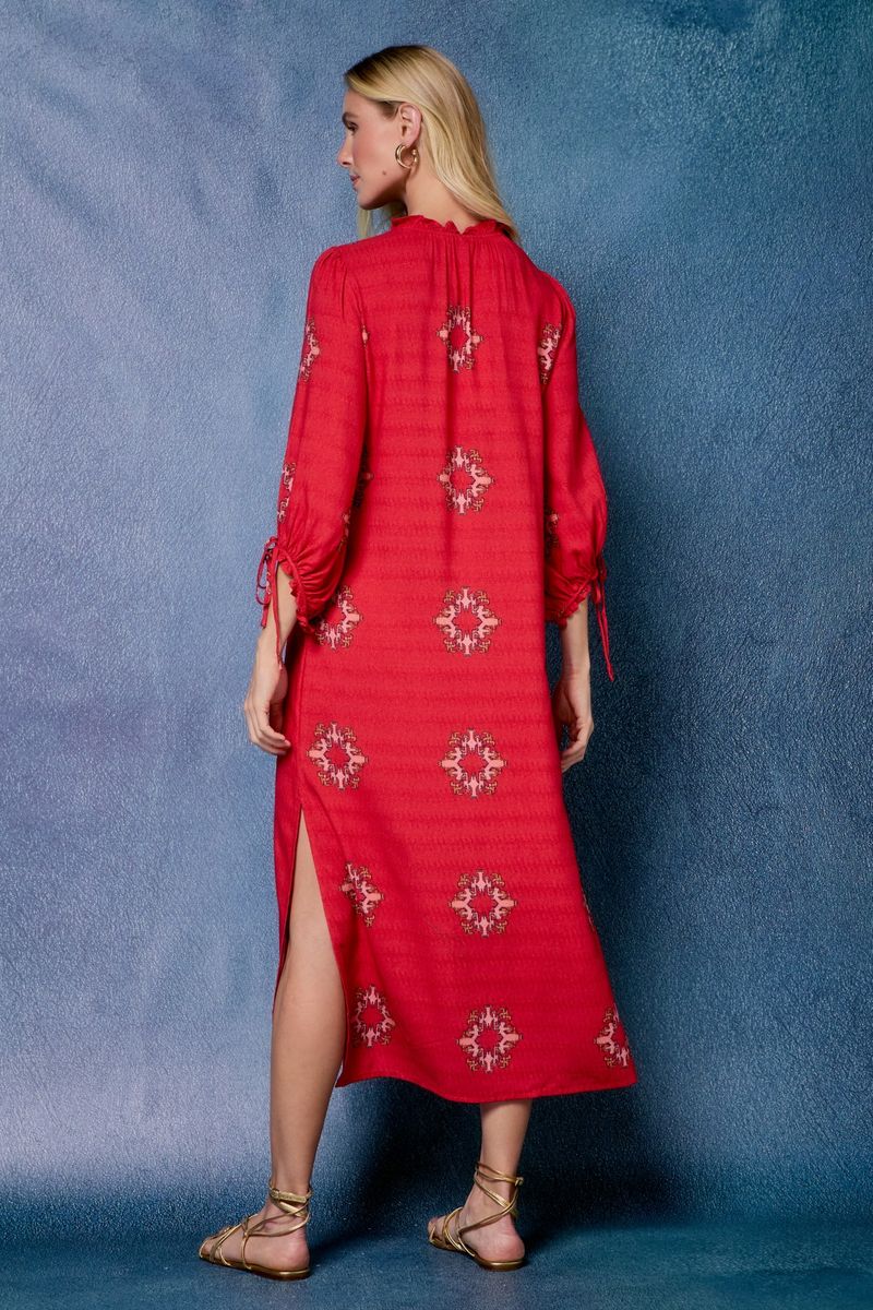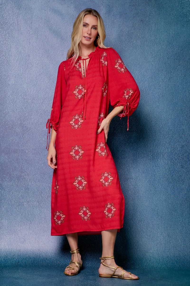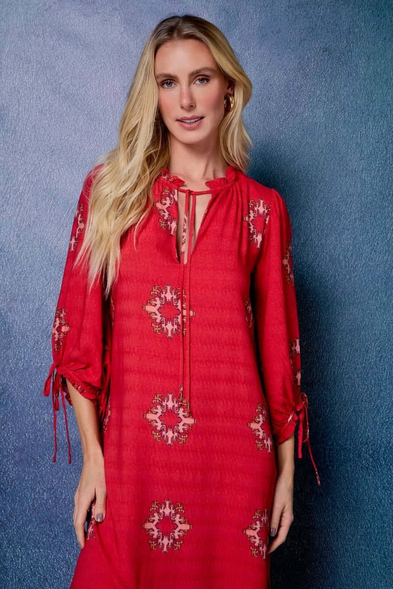 Confeccionado em tecido leve e confortável, o modelo possui comprimento midi e caimento fluido que valoriza o movimento. O decote com amarração delicada traz charme artesanal, enquanto as mangas longas com ajuste no punho acrescentam sofisticação e praticidade. A estampa exclusiva Kaira garante personalidade única à peça.