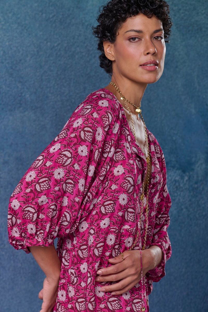 Confeccionado em tecido fluido com estampa floral exclusiva, o modelo apresenta decote em V, manga ¾ com leve volume e recorte com babado na barra, que traz movimento e charme ao look. O caimento solto e confortável valoriza o corpo com elegância e praticidade.