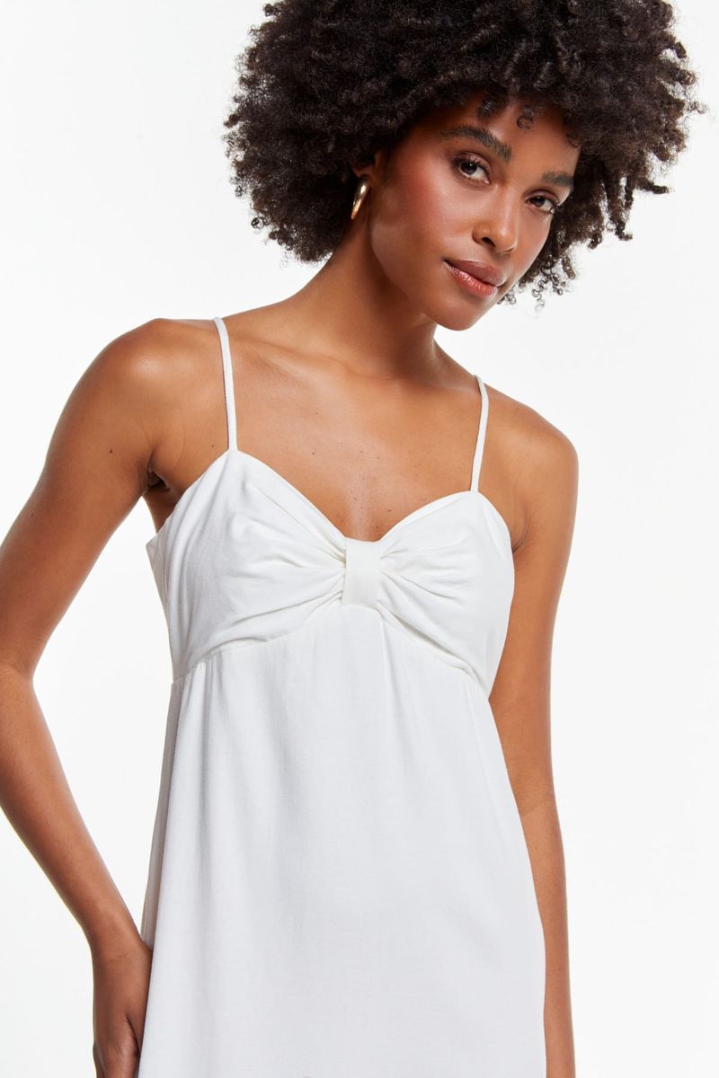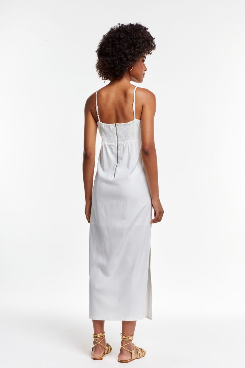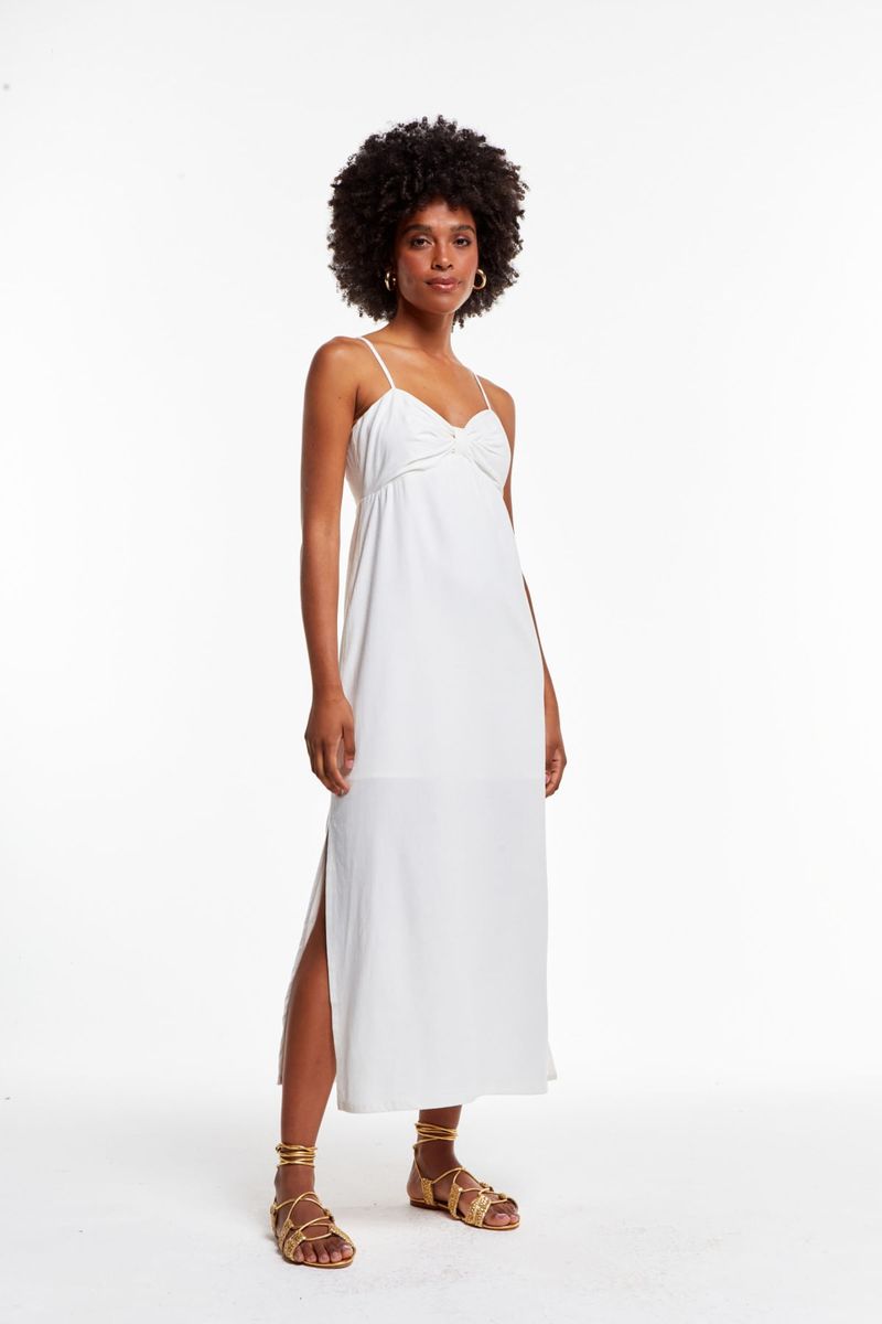 O busto drapeado com torção central valoriza o colo com sutileza, enquanto as alças finas trazem delicadeza ao visual. A modelagem alongada cria uma silhueta fluida e natural, complementada pela fenda lateral que adiciona movimento e um toque sutil de sensualidade. Feito em tecido leve e confortável, é perfeito para compor looks luminosos, sofisticados e descomplicados para o dia ou a noite.