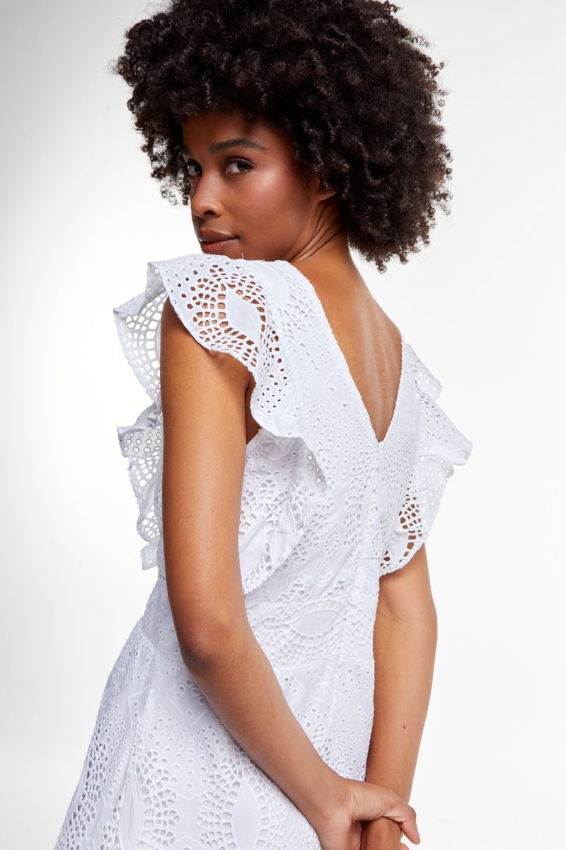 Confeccionado em laise trabalhada, o modelo apresenta decote em V que valoriza o colo, babados delicados nas alças e cintura levemente marcada, criando uma silhueta fluida e equilibrada. O comprimento midi ganha movimento com a fenda lateral, enquanto o acabamento vazado da laise adiciona textura e um toque artesanal à peça.