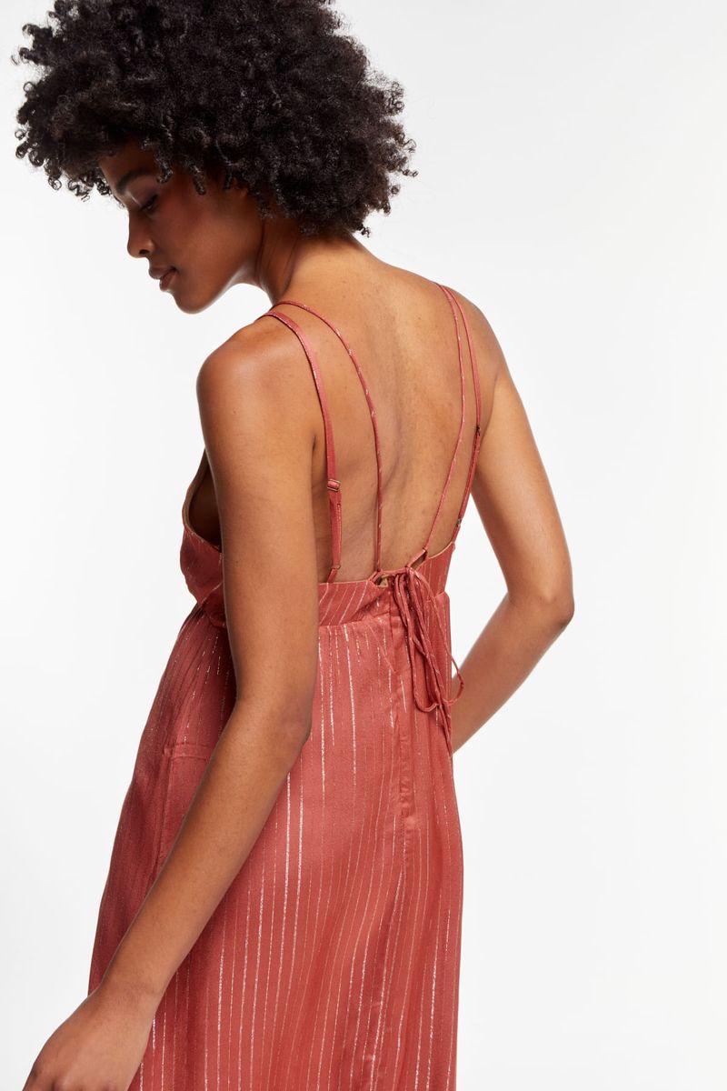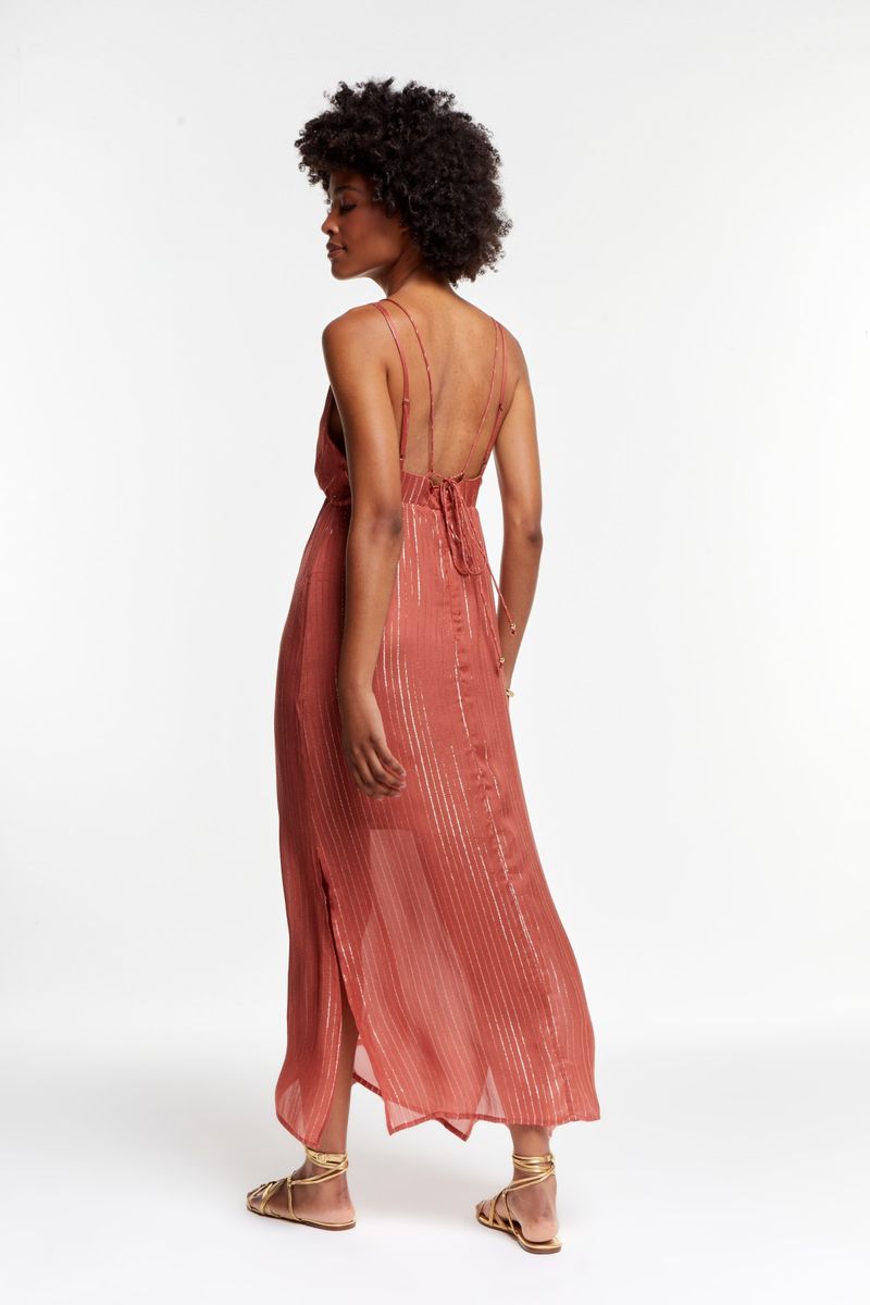 As listras metalizadas trazem um brilho sutil ao tecido, enquanto o decote profundo cria um efeito moderno e marcante. Na parte frontal, pequenos metais dourados adicionam charme imediato, e na parte de trás, as ponteiras douradas finalizam as alças com um toque delicado. A abertura lateral completa o visual com leveza e movimento, deixando a peça ainda mais elegante.