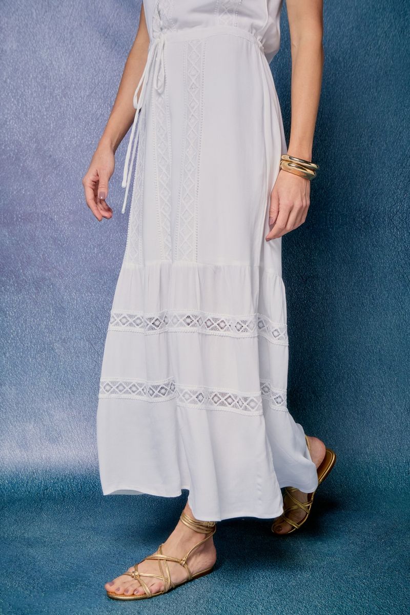 Confeccionado em tecido leve, o modelo conta com alcinhas finas reguláveis, botões frontais que reforçam o charme romântico e recortes com renda que trazem sutileza e elegância. O detalhe de amarração na cintura garante ajuste ideal, enquanto a saia fluida com babado confere movimento e frescor ao visual. Perfeito para compor produções delicadas e sofisticadas.